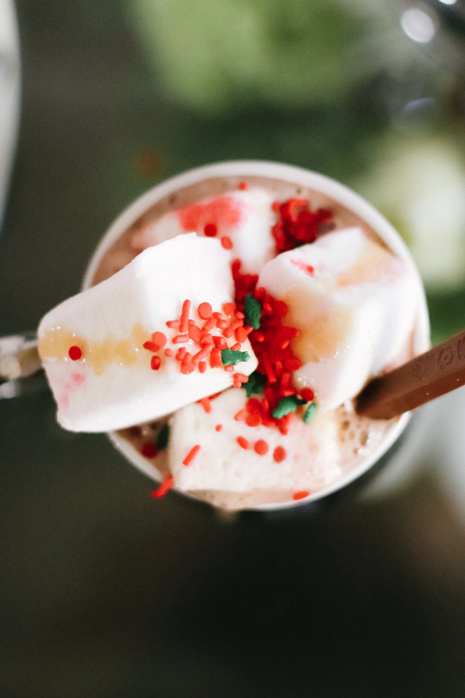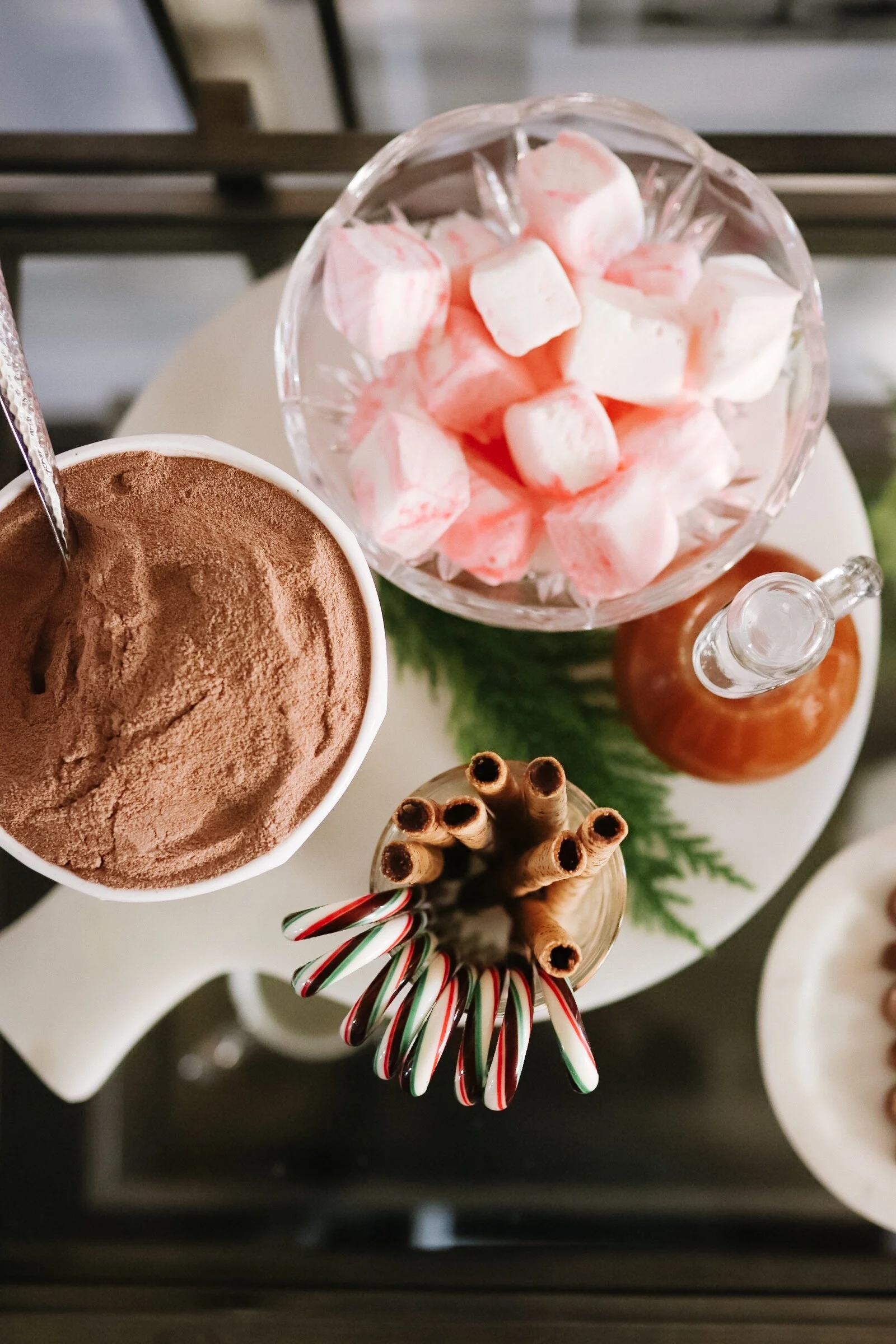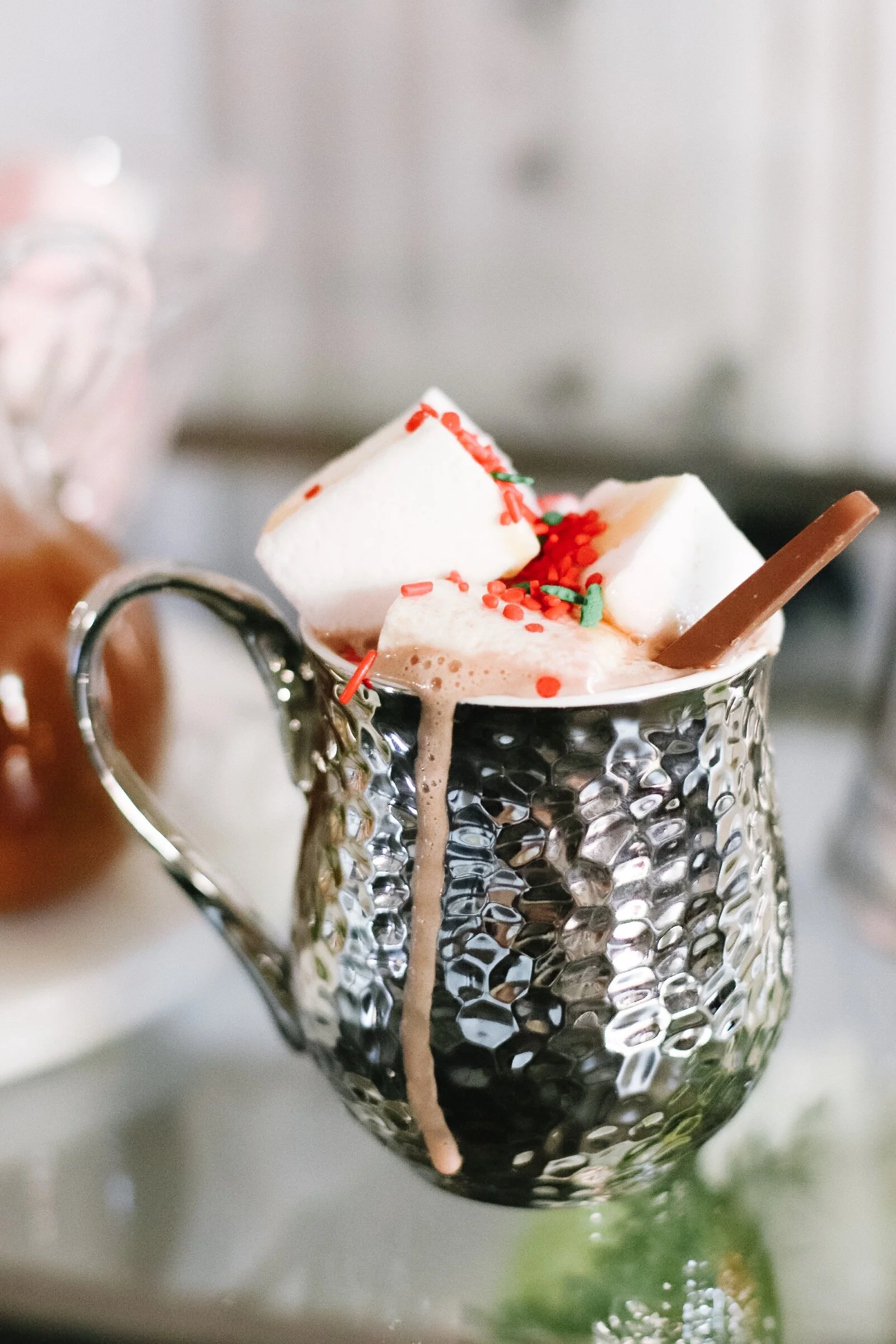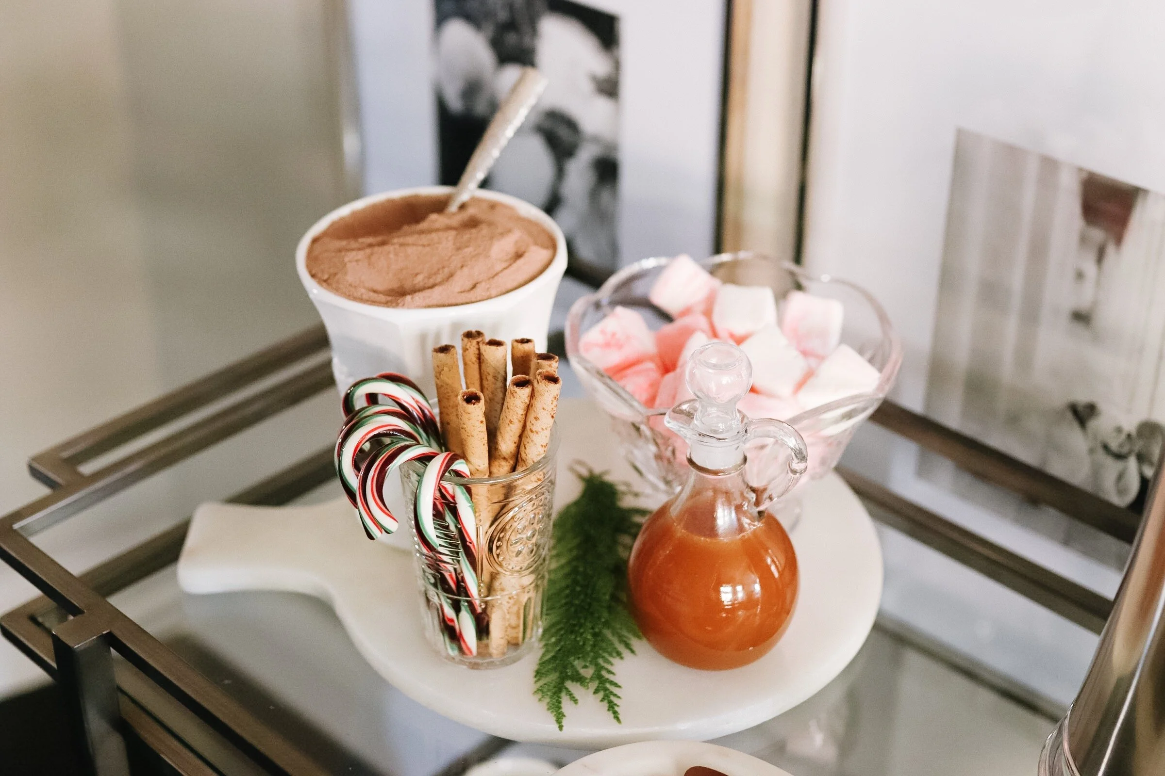 When I thought of a hot cocoa bar, what first came to mind was marshmallows, candy canes, hazelnut, caramel, and sprinkles!