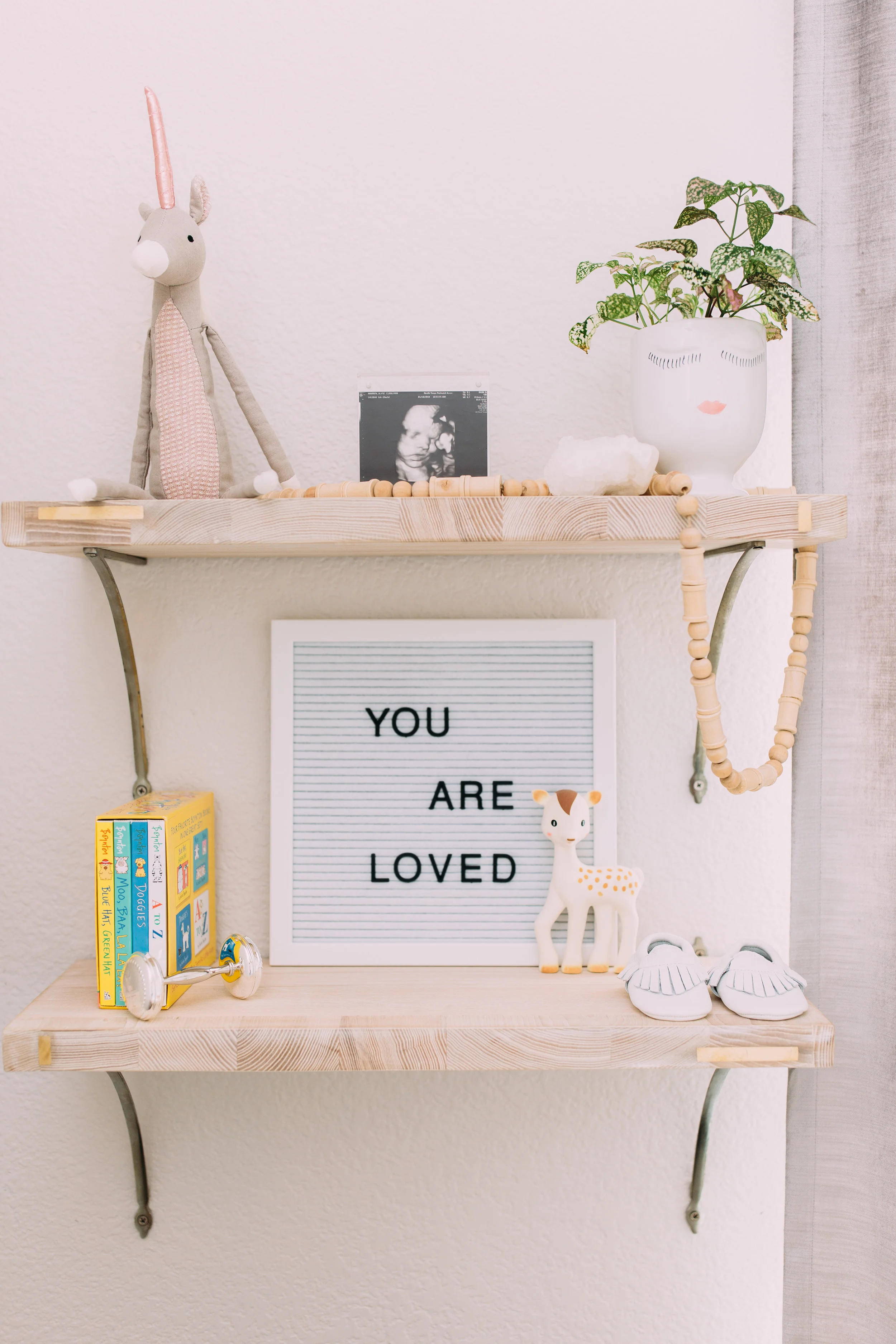 Details like the styled shelves, wall picture frame, and hoop wreaths were the finishing touches. I gathered inspiration for the hoop wreaths from this featured nursery I discovered on Pinterest.