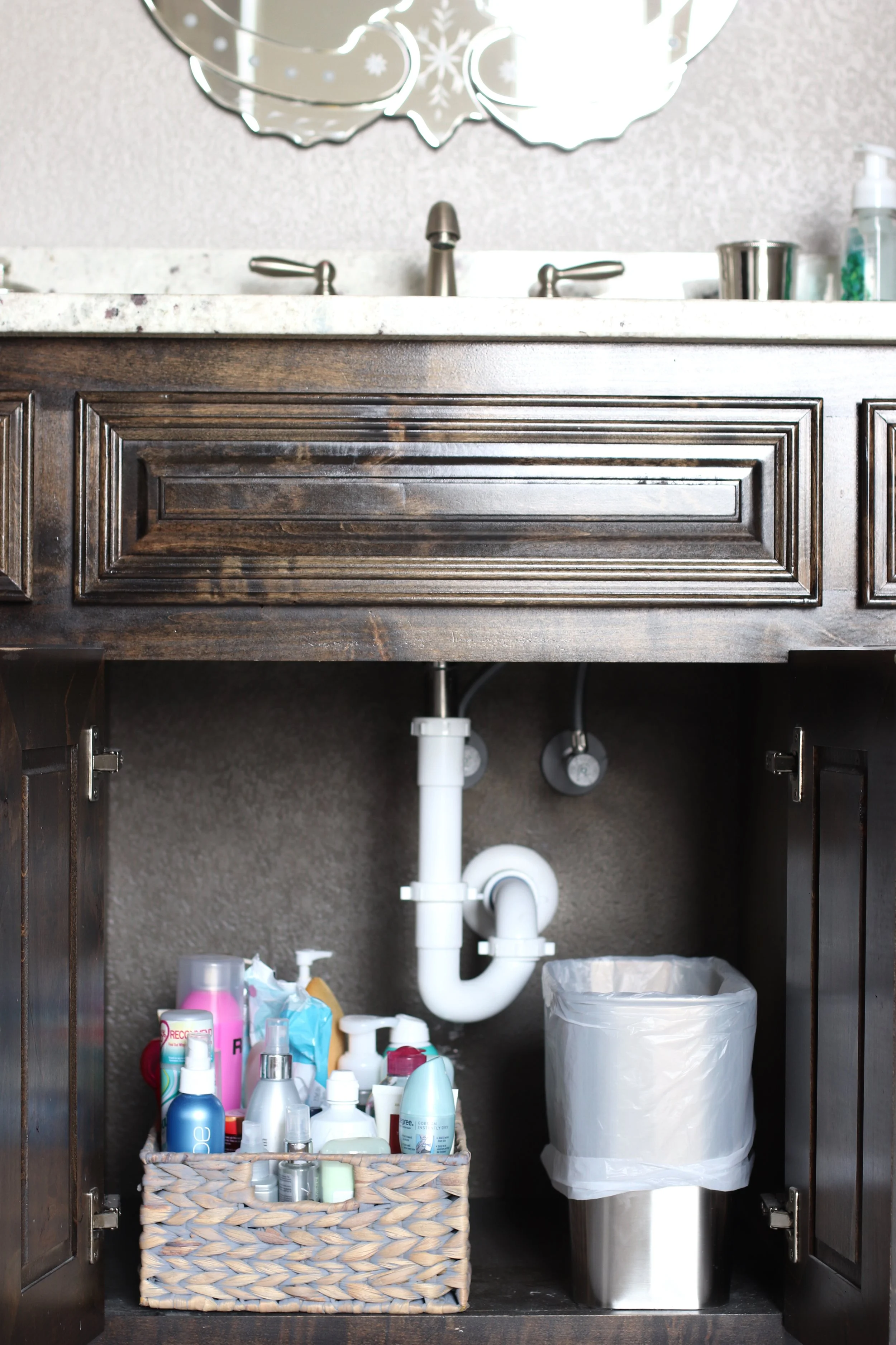 Under the cabinet organization. Use baskets for that awkward under-the-sink space in your kitchen and bathroom. Organize your cleaning products as well as your beauty products and styling tools.